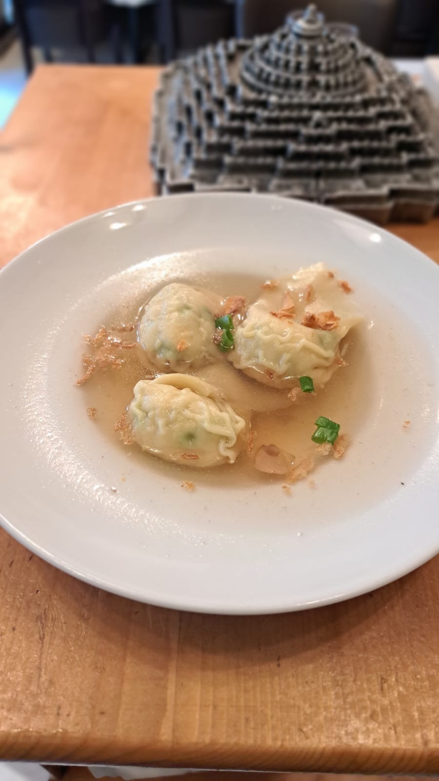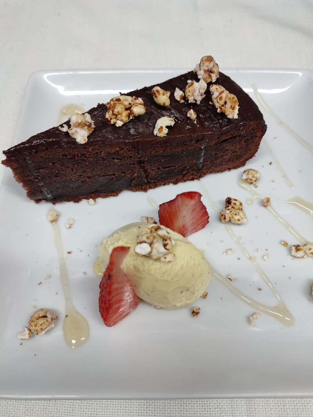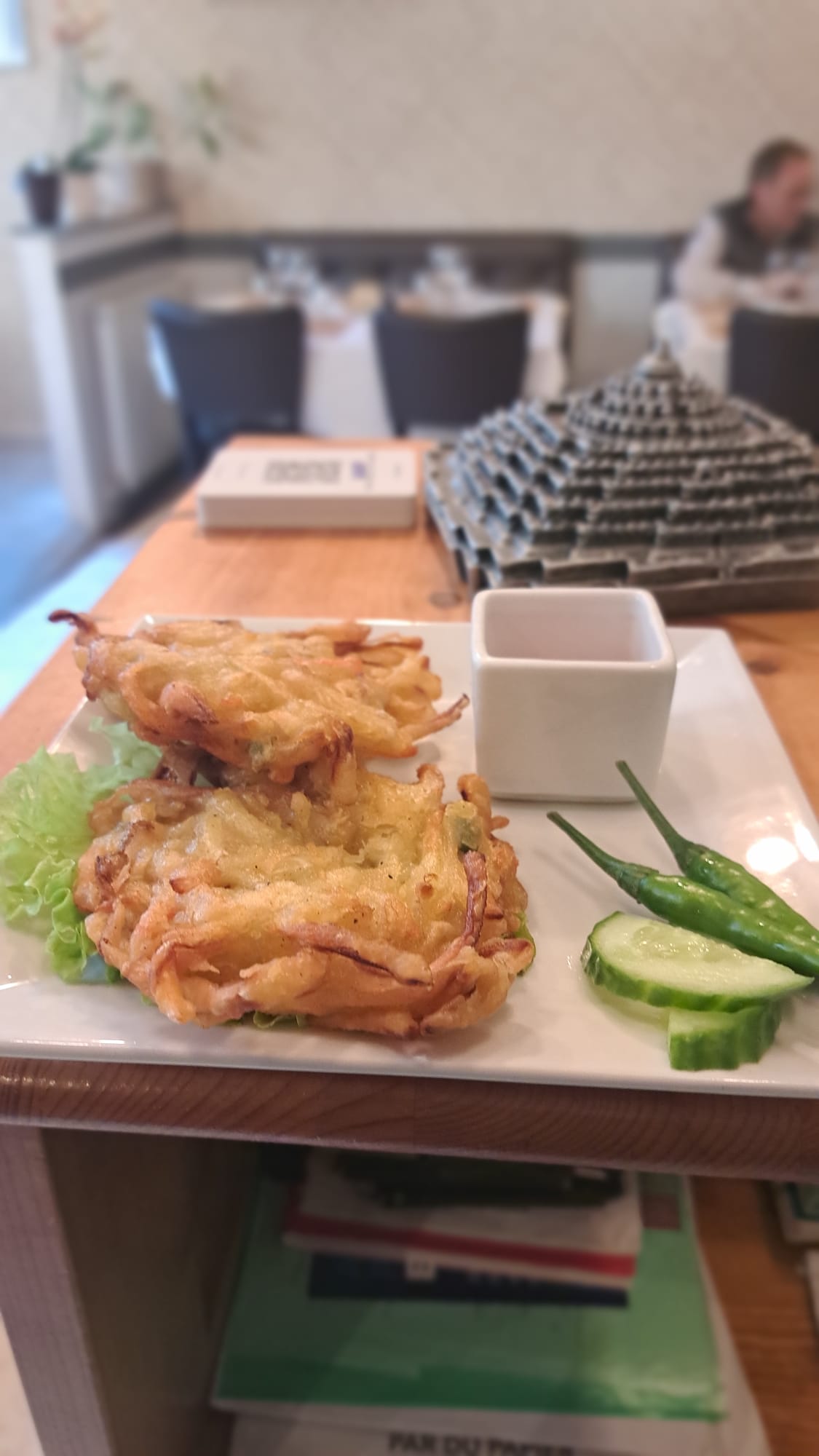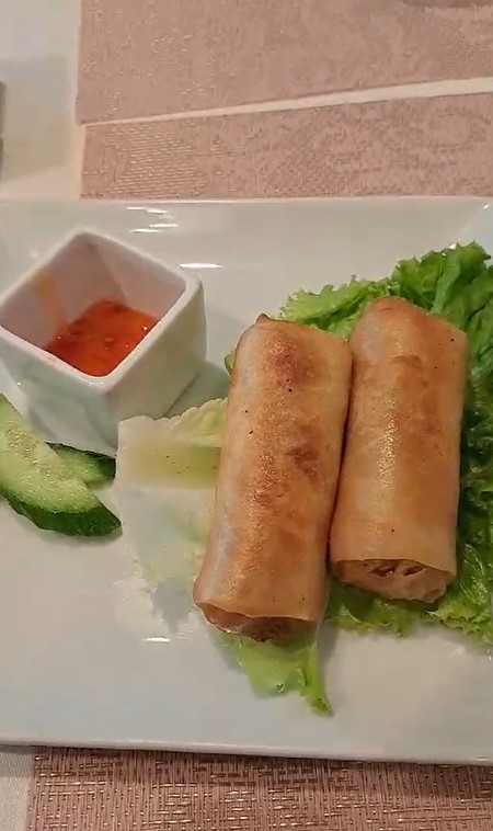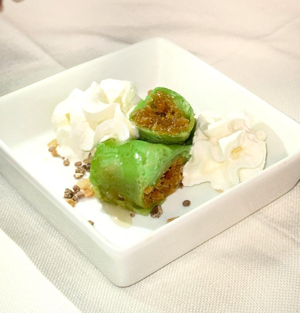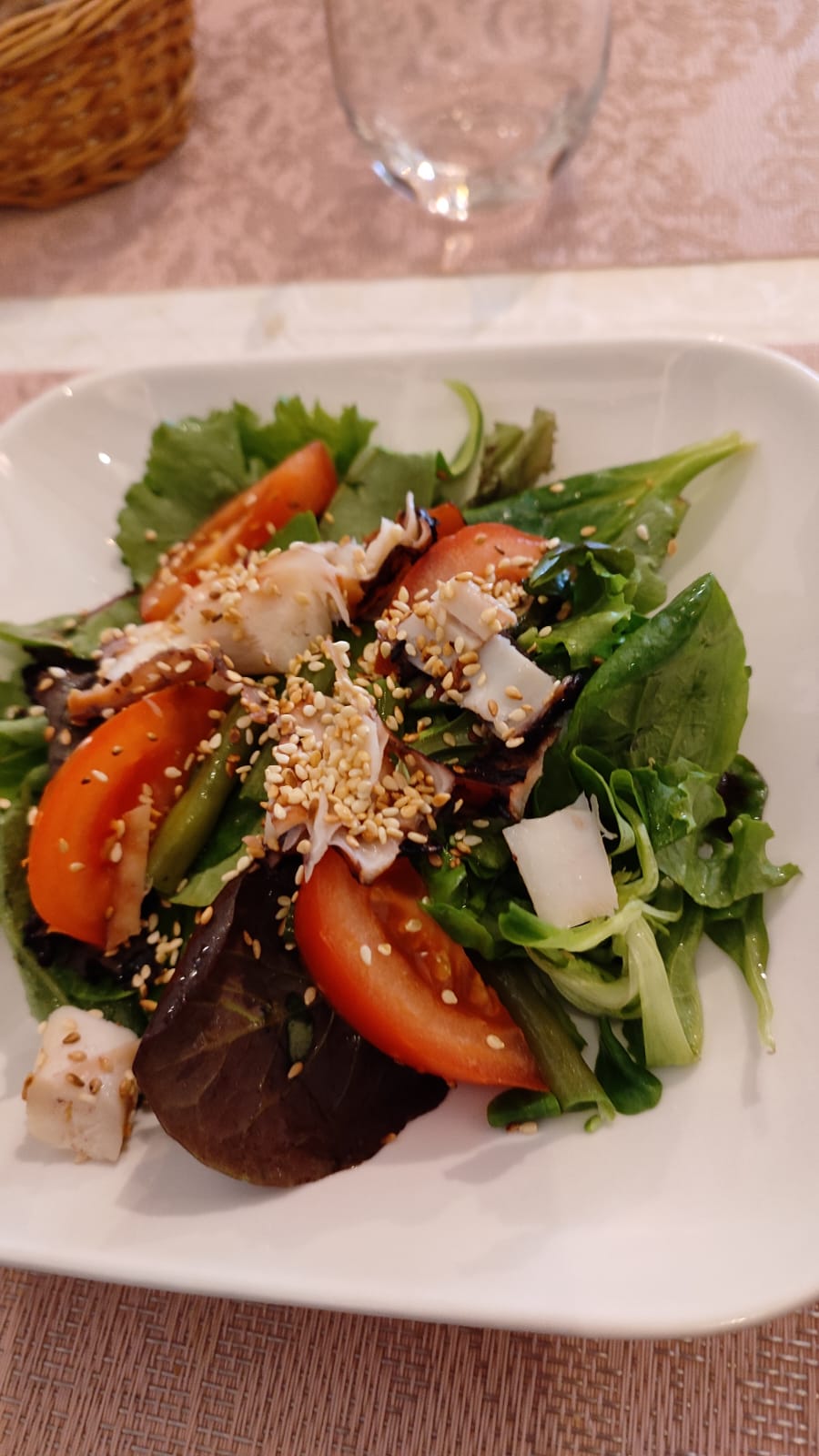 Young greens, green beans, tomatoes, sesame seeds and giant squid tentacles with an indonesian dressing (Soy, lemon, olive oil and sesame oil)