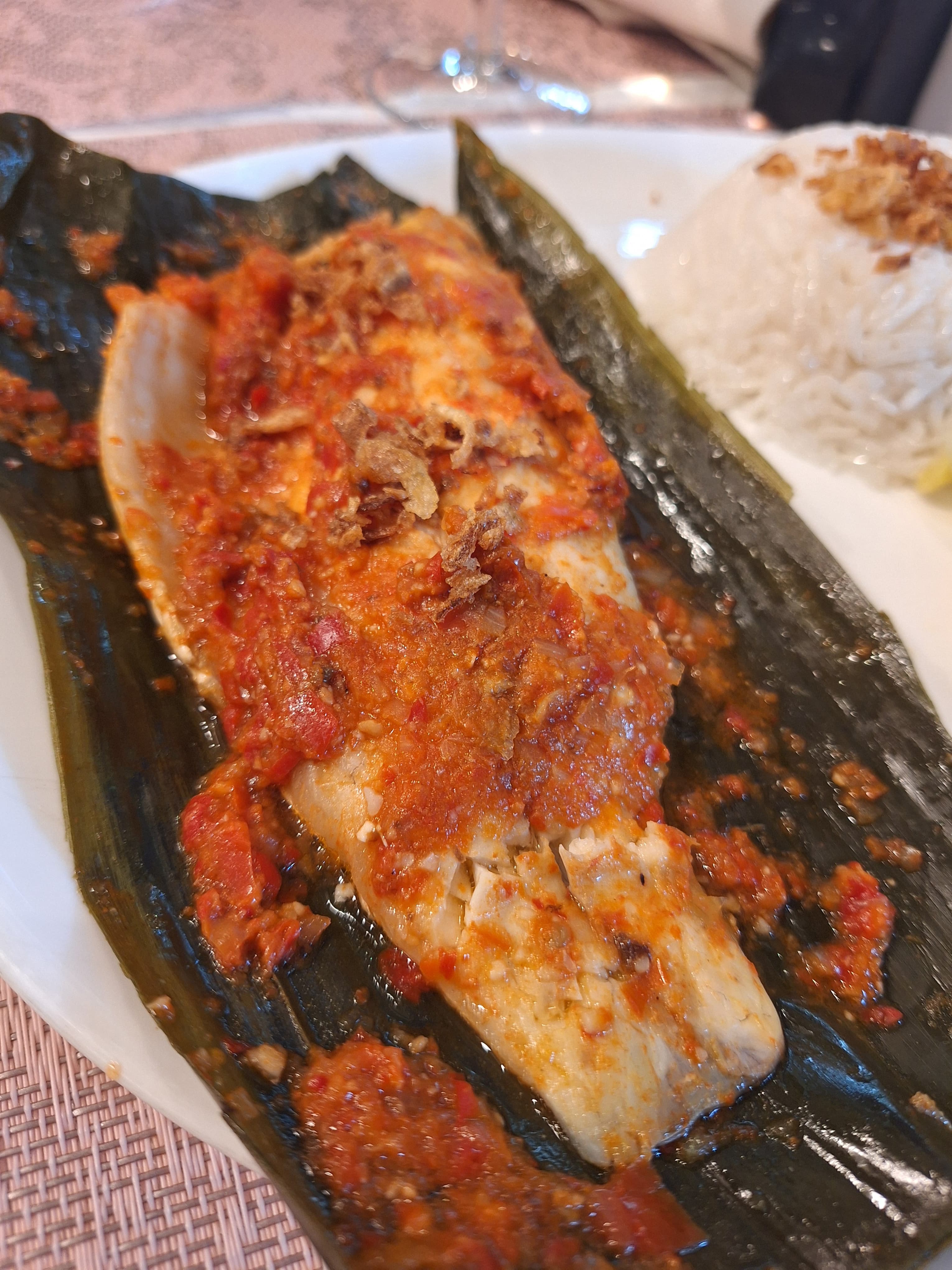 Fish fillet wrapped in banana leaf with bell pepper compote, tomato and lemongrass. Served with jasmine rice and stir-fried vegetables