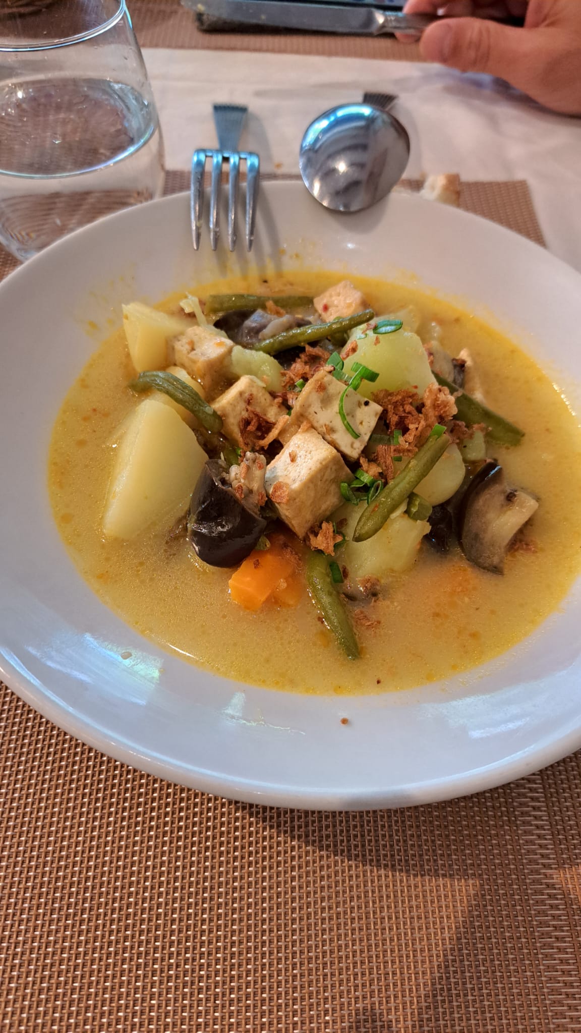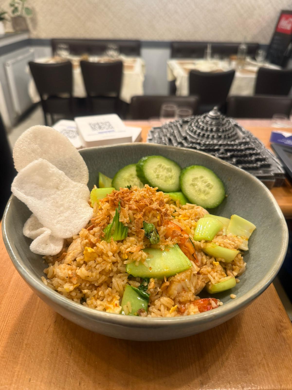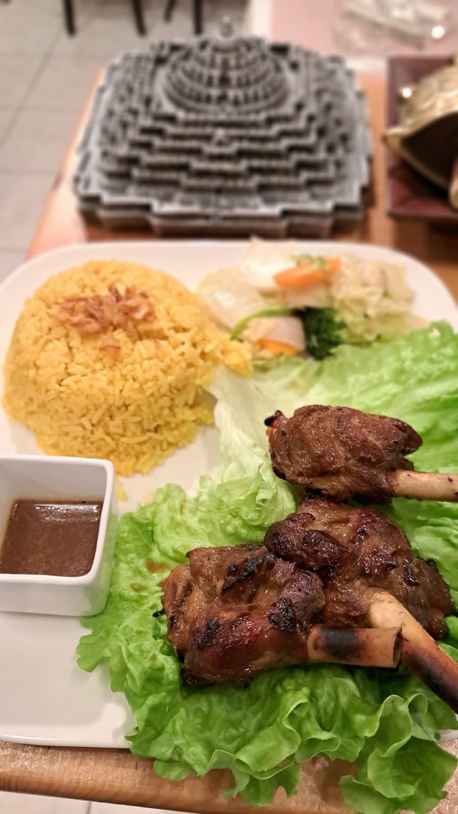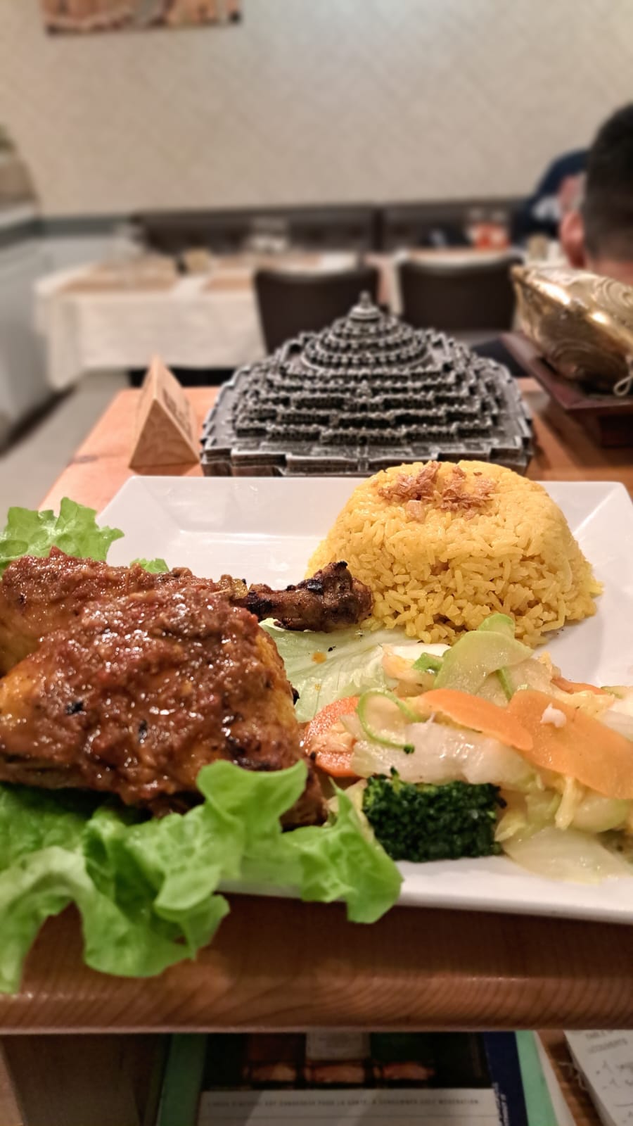 Chicken skewers with peanut sauce, stir-fried vegetables, served with rice or fries (your choice)